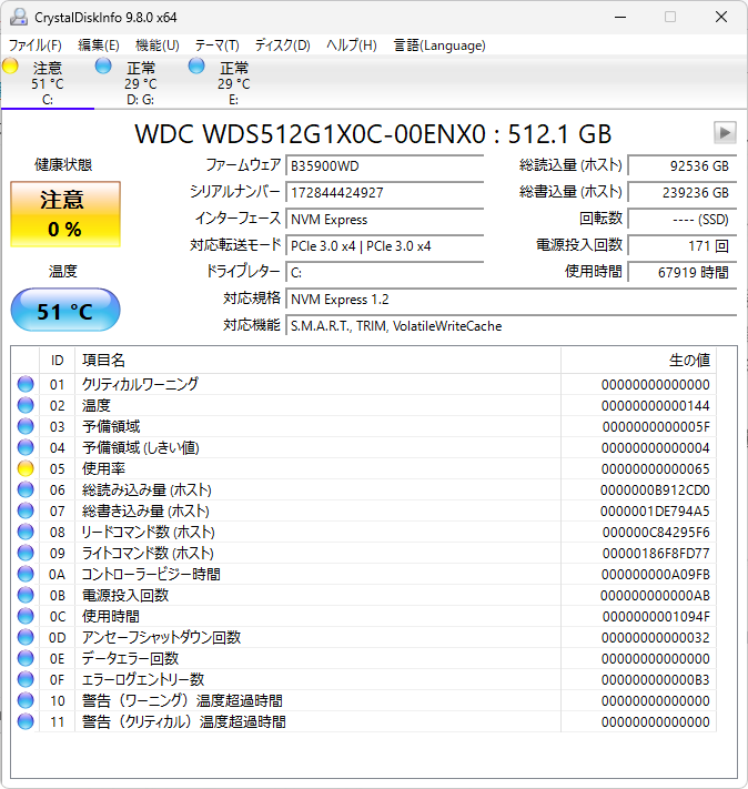 ある日ふと、Crystal Disk Infoを起動したら「注意(0%)」の文字が目に飛び込んできました。2018年6月に購入したWDのNVMe SSD「WDC WDS512G1X0C-00ENX0」が、ついに寿命を迎えたようです。